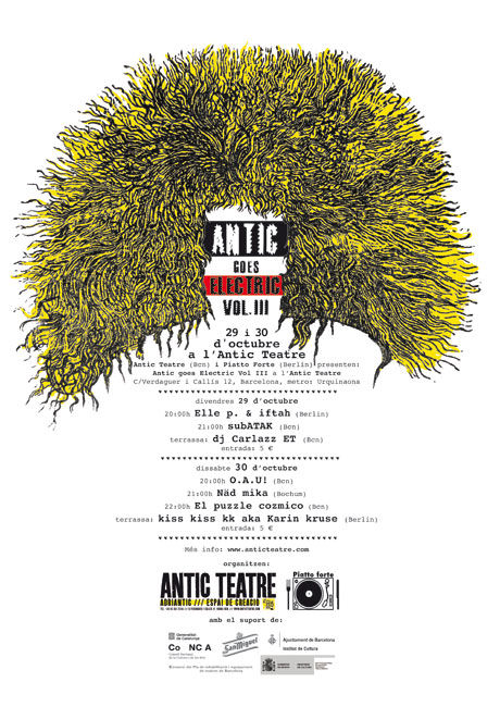 The first edition of "Antic Goes Electric / AdriAntic goes electric Vol I" was held in Barcelona in 2008, with participation of international DJs and VJs. This festival for artists from Barcelona and Berlin combine live music by new avant-garde electronic artists with new tendencies visual projections.